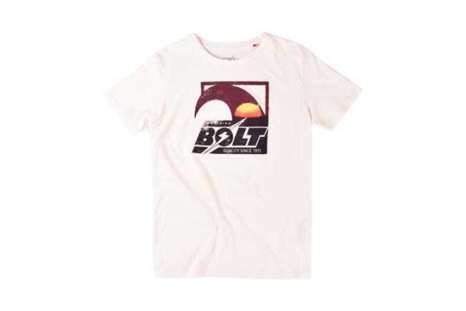 Esta camiseta tiene una serigrafía en la parte delantera central con la palabra BOLT simbolizando su logo.