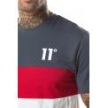 Cuello redondo y logotipo de 11Degrees bordado. Panel azul marino con franja en rojo.