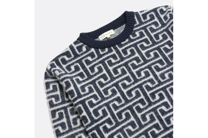 Jersey Ramble Knit Azul-Blanco se trata de un jersey grueso de cuello redondo inspirado en los pescadores.