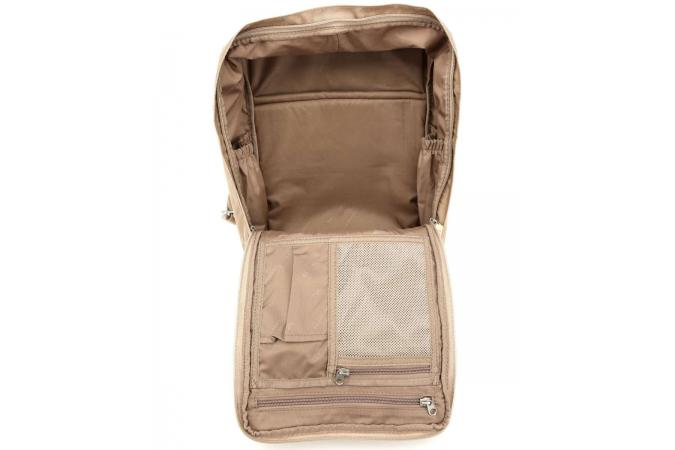 La Mochila Macaroon Almond tiene un compartimento de almacenamiento principal que viene con una funda acolchada para tu portátil, dos soportes para bebidas interiores con cordones y varios bolsillos y ranuras para organizadores.